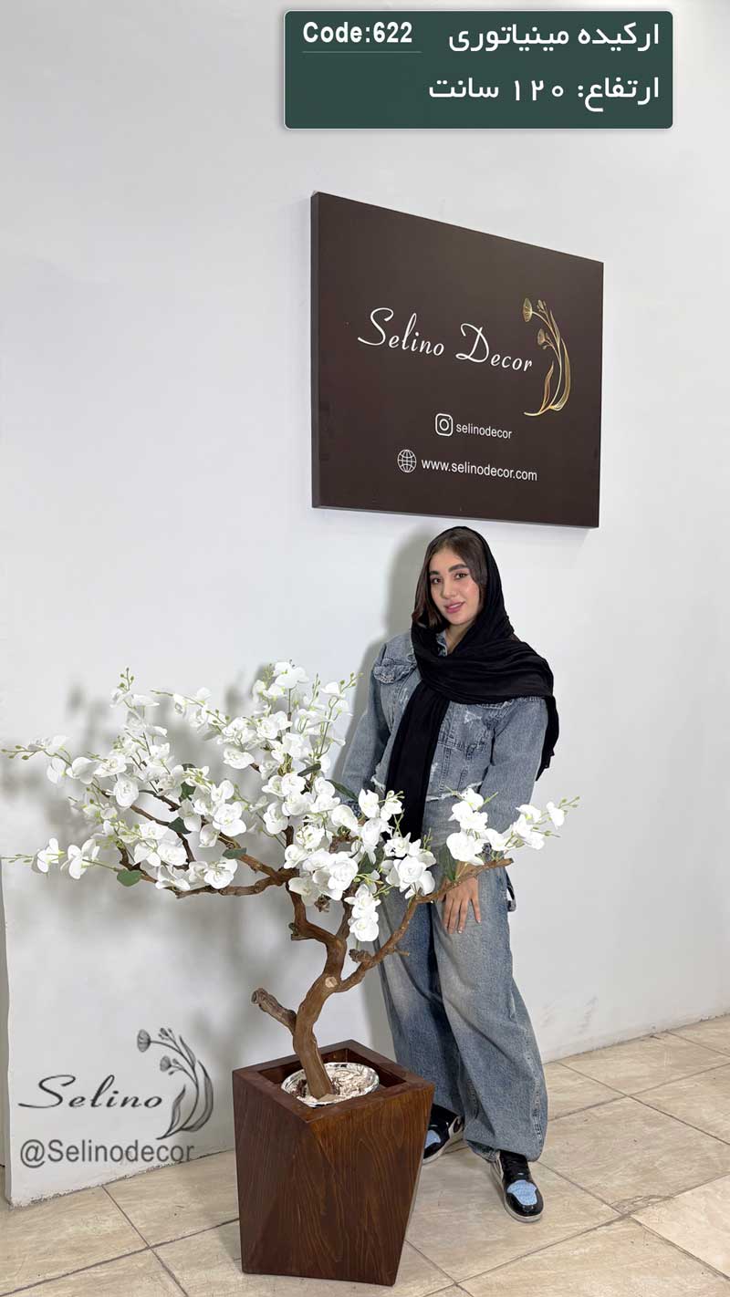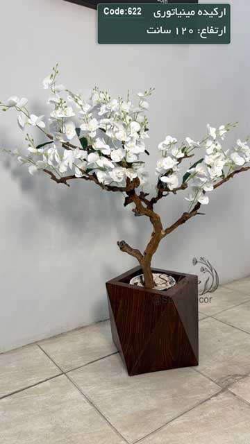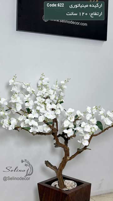 درختچه مصنوعی با ارکیده مینیاتوری 120 سانت با تنه چوب طبیعی